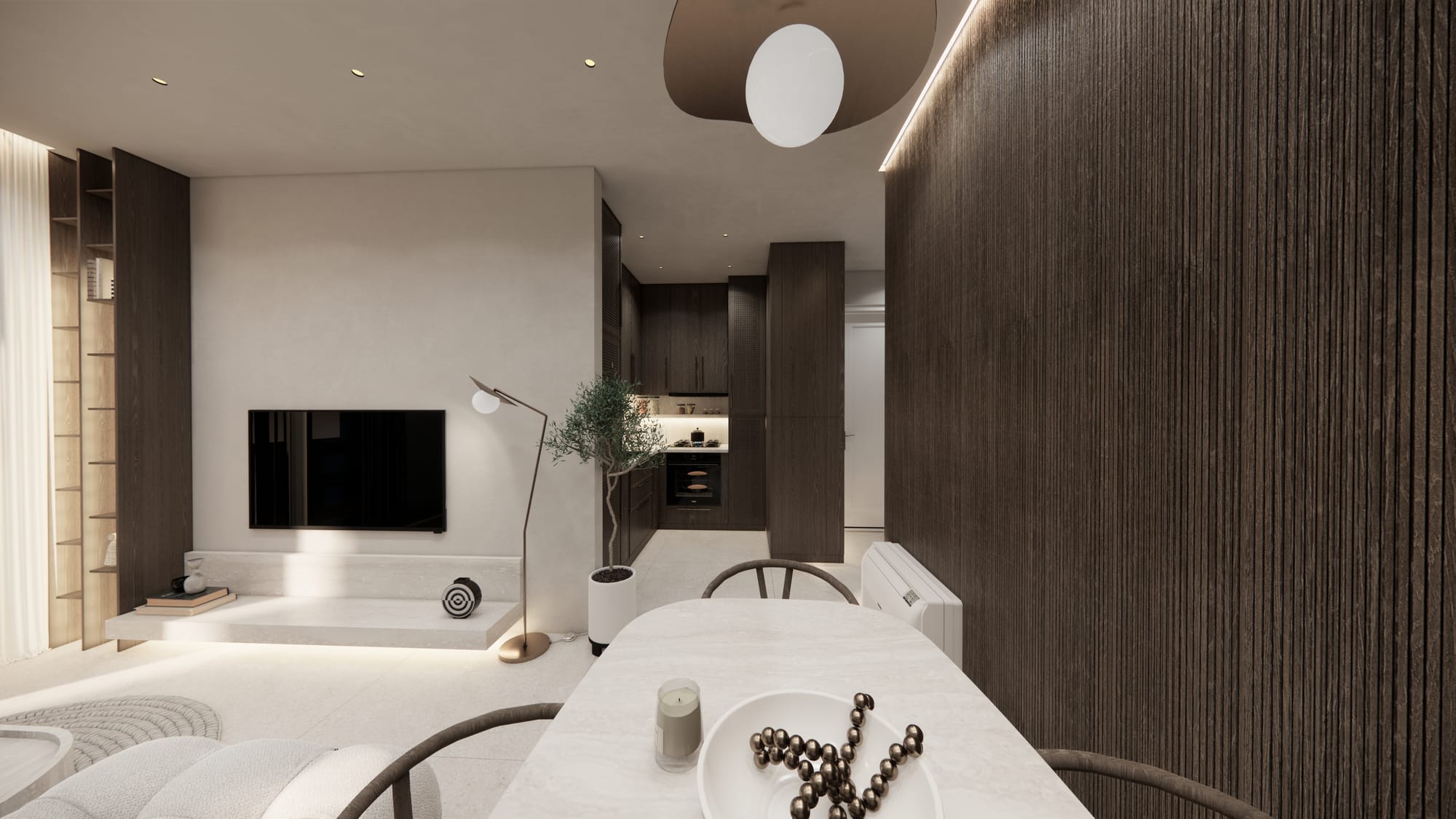 “Living Room Design with Marble Fireplace & Vertical Reveals”